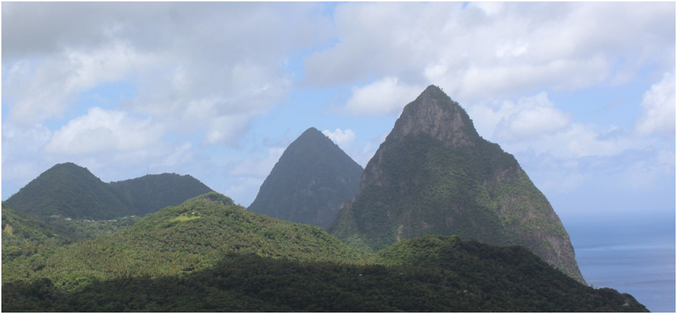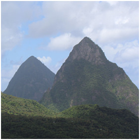 The Pitons, St. Lucia’s twin towering peaks that’s first thing you can see from airplane and prime topographic feature that soar out of the sea the twin volcanic cones.